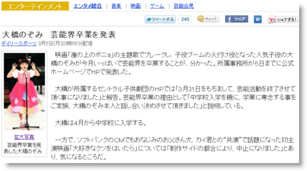 子役ニュース 大橋のぞみちゃん芸能界引退へセントラル子供劇団2012年3月31日正式 セントラル子供劇団(東京)に所属する大橋のぞみちゃんが中学校入学を前に芸能界を正式に引退すると発表した。 2012.03.06 子役ニュース